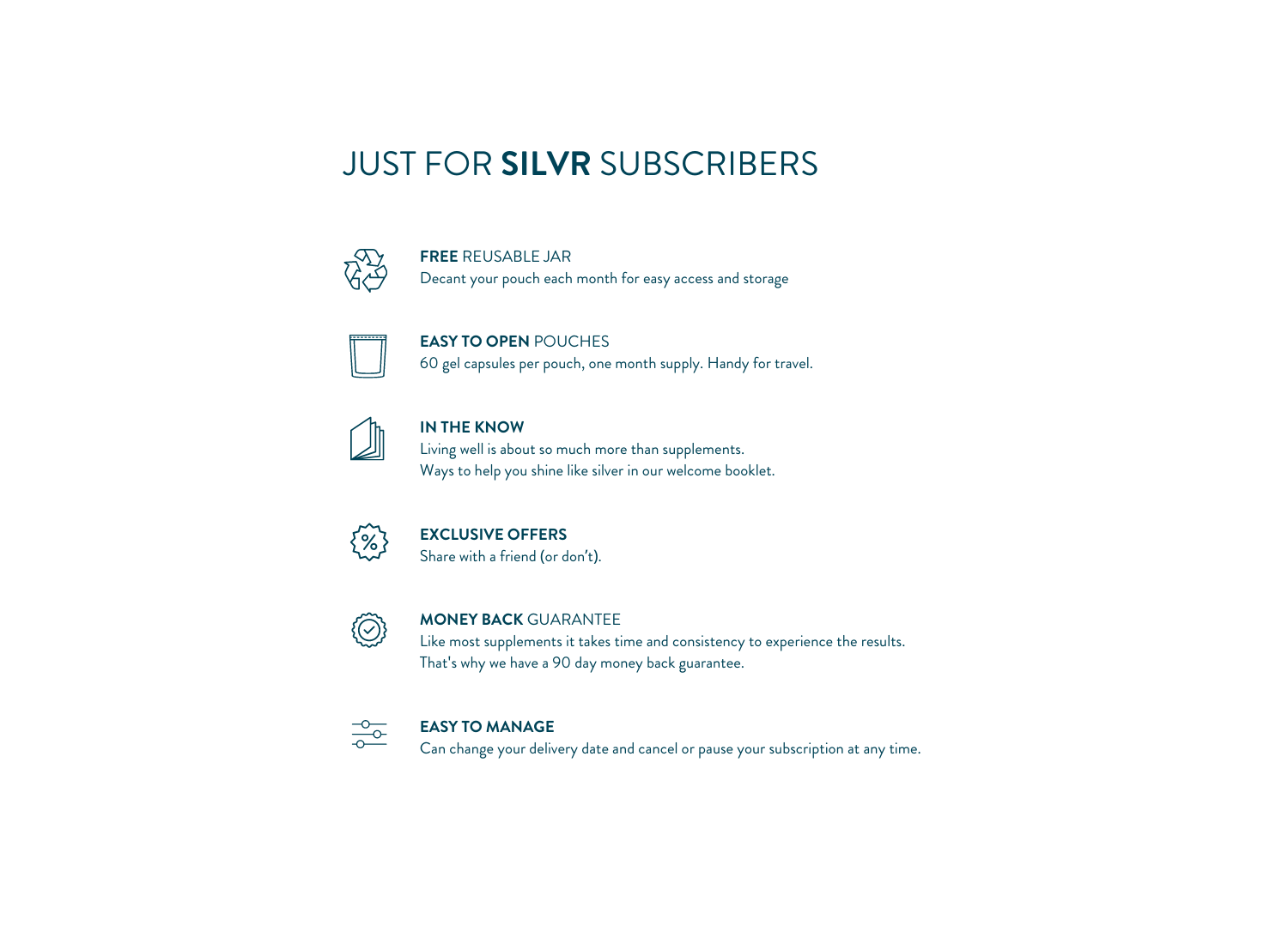In a groundbreaking move for the UK, our formulations are supercharged by the patented Swiss technology, VESIsorb®, optimising the absorption and bioavailability of the key ingredients. Ensuring what you take from SILVR is what you get, delivering the full benefits of our products.